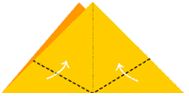 2. Полученный треугольник сложите пополам и разверните (чтобы отметить сгибом центр). Разверните ушки кота (нижние углы полученного треугольника) наверх и в стороны.