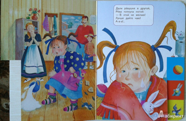 Родитель. Как зовут девочку, про которую мы прочитали стихотворение? Почему де­вочку называют рёвушкой? Что не нравилось девочке? Чем она вытирала свой нос? Как выгля­дит девочка-рёвушка? (Ответы детей.) Посмотрите на двух девочек и скажите, кто из них ка­призная. (Обращает внимание детей на фланелеграф. Дети выбирают из двух фигурок нуж­ную.) Как вы узнали девочку-рёвушку? (Дети описывают девочку: нос красный, распух, глаза заплаканные.)