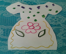 Родитель. Посмотрите, платье у нашей рёвушки все мокрое. Давайте изготовим для Гани-рёвушки новое платье. Может быть, тогда она перестанет капризничать и плакать. У меня есть вот такое белое платье. (Показывает лист бумаги с нарисованным силуэтом платья.) Чтобы платье стало нарядным и красивым, я его украшу узором.