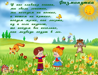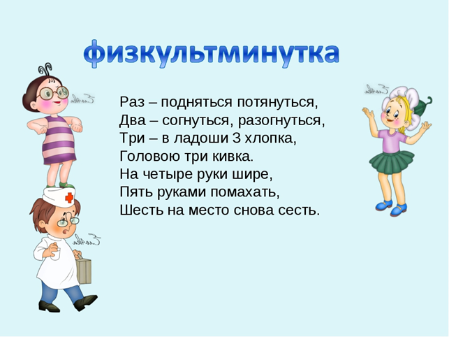 Раз — согнуться, разогнуться.  Два — нагнуться, потянуться.    Три — в ладоши три хлопка. Головою три кивка.